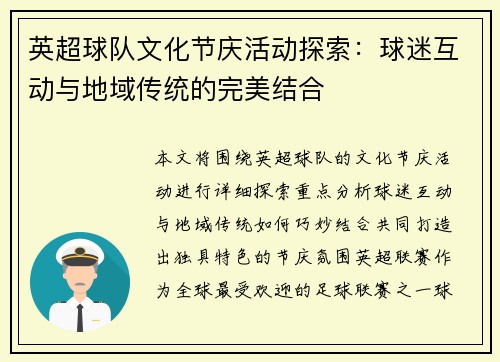 英超球队文化节庆活动探索:球迷互动与地域传统的完美结合
